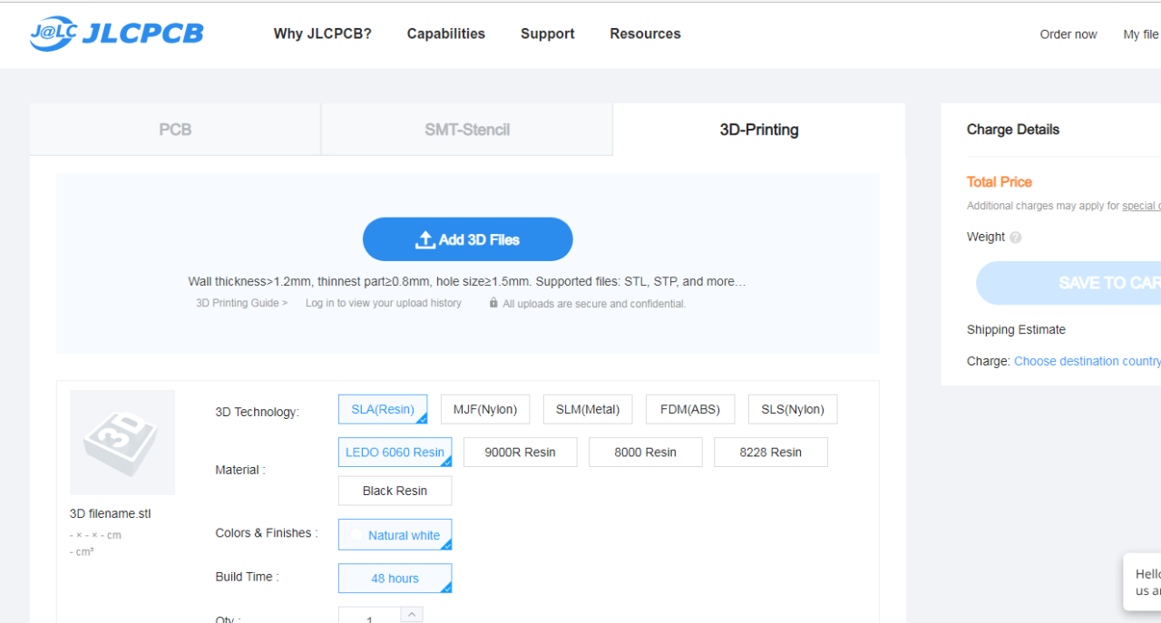 JLCPCB 3D printing service includes international shipping; they will ship components straight to your door.