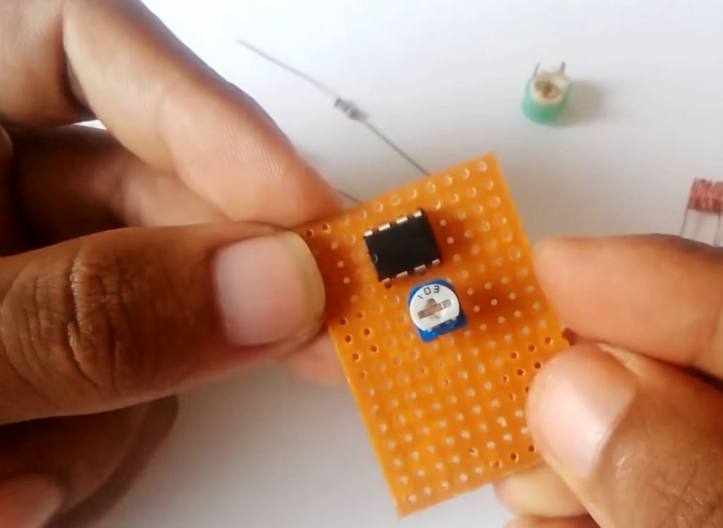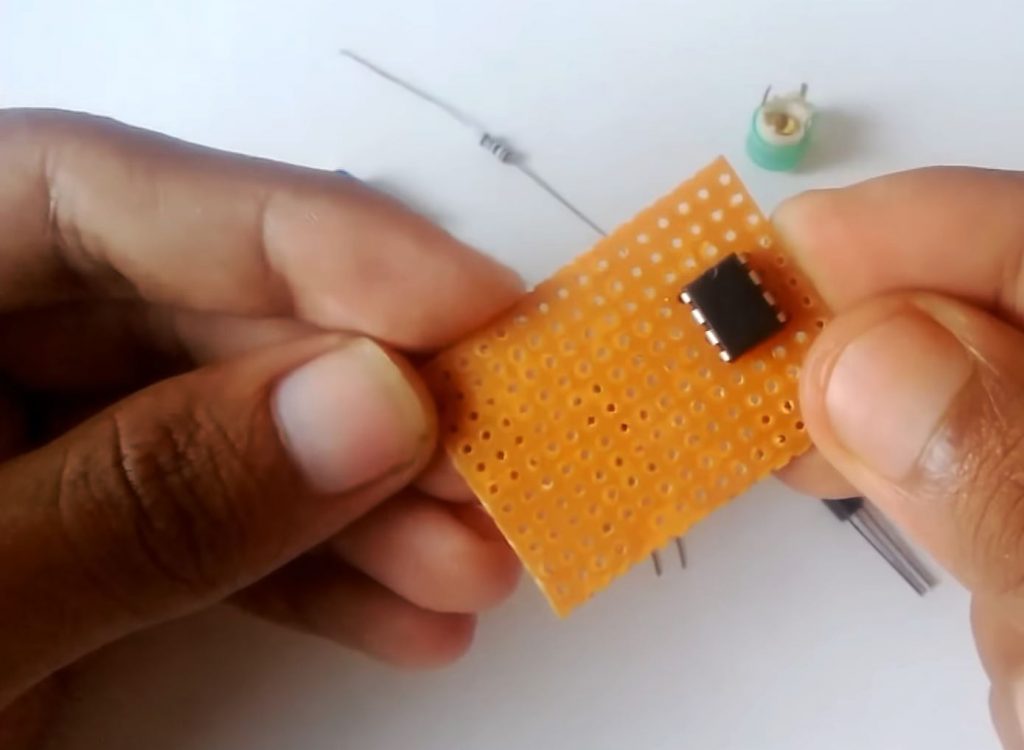 1) Solder the LM386 IC on the veroboard. After that, short pin 2 & 4 of the IC with each other.