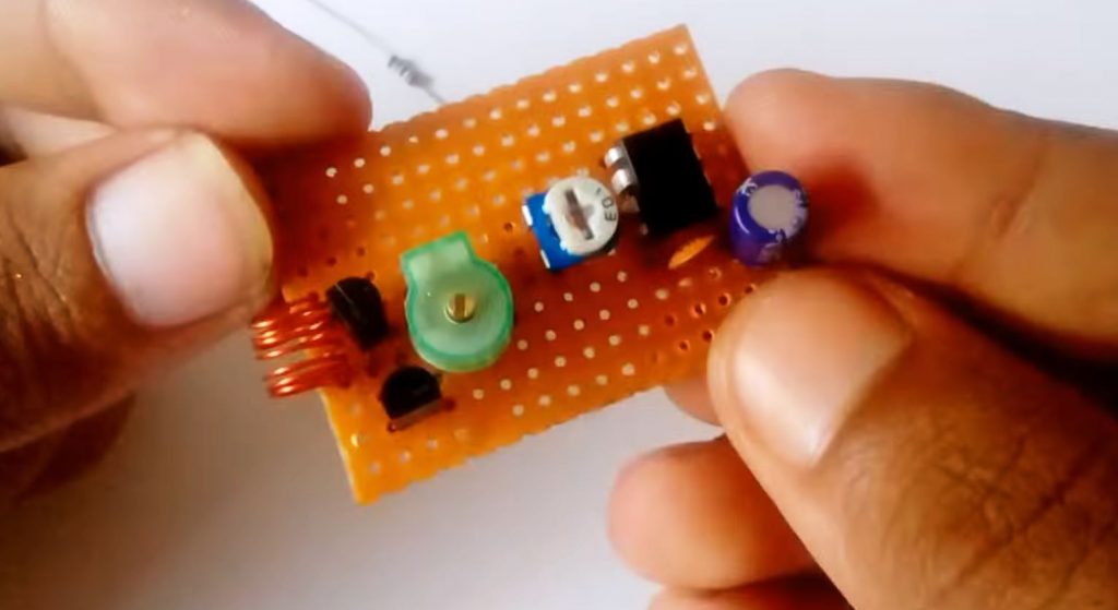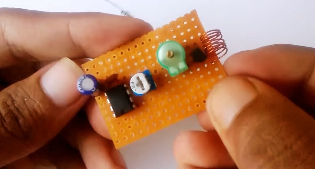 5) Solder the aerial antenna (made by using a 7 Turn Coil of 27 AWG magnet wire) between the collector – base terminal of the BF494 transistor.